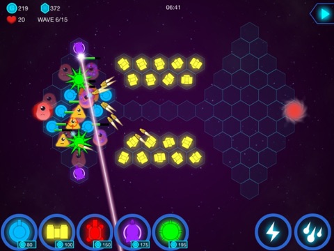 4.Laser tower: Mass attack. Low attack speed. Medium damage. Medium range;