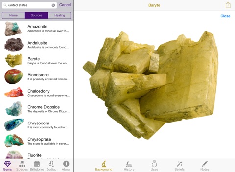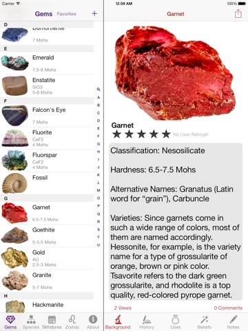 100+ GEMSTONES! Each gemstone has a high-resolution zoomable image and information on their alternative names, classification, formula, hardness, background, history, sources, enhancements, uses, mythical and healing properties, and planetary associations.