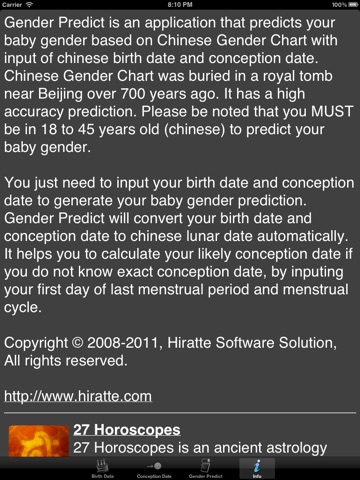 Gender Predict is an application that predicts your baby gender (boy or girl) based on Chinese Gender Chart with input of chinese birth date and conception date. Chinese Gender Chart was buried in a royal tomb near Beijing over 700 years ago. It has a high accuracy prediction. Please be noted that you MUST be in 18 to 45 years old (chinese) to predict your baby gender.