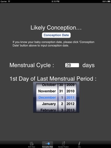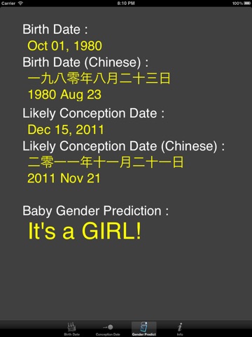 You just need to input your birth date and conception date to generate your baby gender prediction. Gender Predict will convert your birth date and conception date to chinese lunar date automatically. It helps you to calculate your likely conception date if you do not know exact conception date, by inputing your first day of last menstrual period and menstrual cycle.