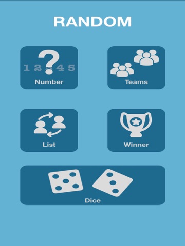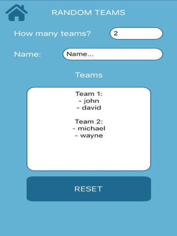 - Choose teams: Adds all the names of the people you want and select how many teams want to be created, and the app will create teams with random people. Perfect for football and any sport, or board games.