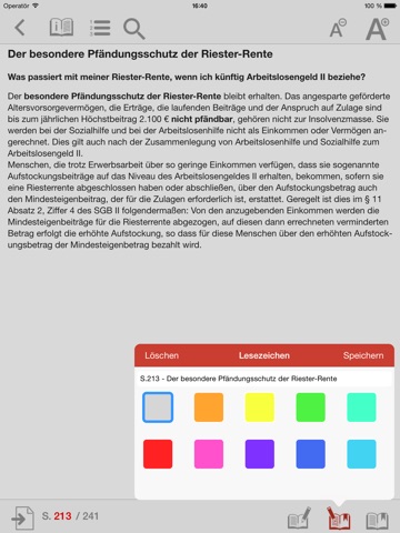 Die App ist sehr benutzerfreundlich mit einem detaillierten Inhaltsverzeichnis aufgebaut. Sie ist ausgestattet mit einer Volltextsuche, einer seitenbezogenen Notizfunktion und der Möglichkeit, bunte „Post-it“ – Notizen an den „Seitenrand“ zu heften, die das Auffinden von wichtigen Textpassagen erleichtern.