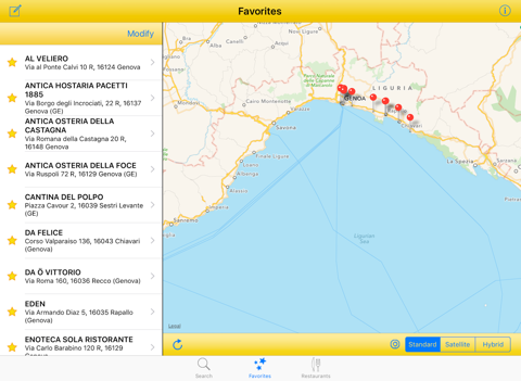 The Genoa Liguria Gourmet app is a universal application which allows you keep tabs on all the restaurants which have earned the Chamber of Commerce’s seal of approval. In it you can get general restaurant information and read about the dishes on offer. There are also photos. Moreover, through the app you can contact the restaurant directly either by phone, mail or through the restaurant’s own website. Narrow your search according to several criteria, such as distance from current location (if you are already in Liguria), by price range or available services, then store your favorite restaurants in the relevant section. If you like the app will let you share restaurant contact info via Facebook, Twitter, email or SMS (iPhone users only).
