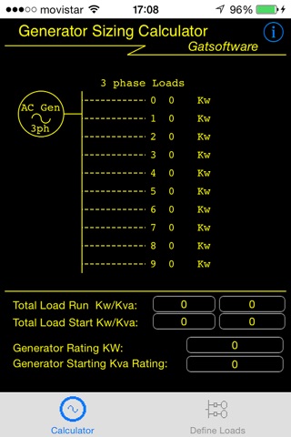 Synchronous generator size estimation based on the load. Admit up to 10 loads among Induction motors, Resistive and inductive loads. The generator KVA rating is 10% over estimated as a buffer for additional loads.