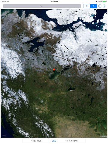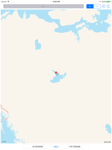 2. Use one finger long press a point in the map for 0.5 second, release finger, there will be a red pin drop on the map indicate the location, latitude and longitude of this point will also display at the botton of screen