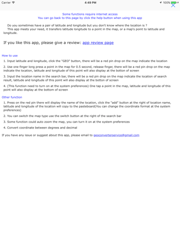 1. Input latitude and longitude, click the "GEO" button, there will be a red pin drop on the map indicate the location