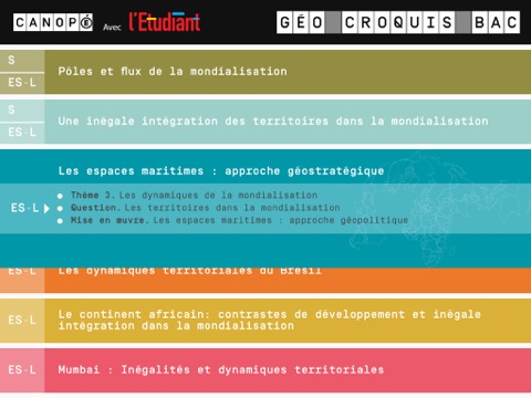 Géo Croquis Bac est un outil de référence pour le cours de géographie en classe de terminale. Projetée à laide dun vidéoprojecteur relié au smartphone ou à la tablette de lenseignant, cette application constitue un support pédagogique précieux pour vérifier la bonne compréhension des termes du sujet puis construire pas à pas la démarche de réalisation dun croquis de géographie. Elle est également un outil de révision efficace pour les élèves préparant lépreuve de géographie de terminale.
