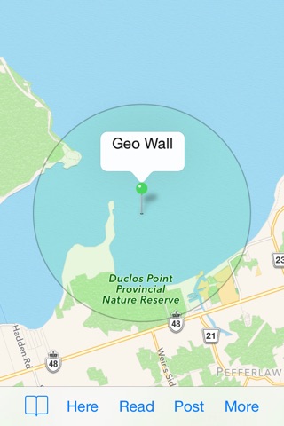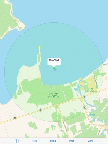 When you tap on the map the green circle defines a Geo Wall. A Geo Wall is a region where your messages are posted to or read from.