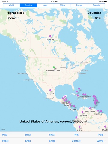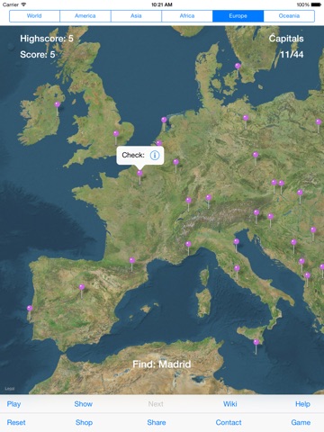 Wiki: use this button to go to the wikipedia page of the country or capital asked in the current question and subsequently show the location of the this country or capital (no points can be scored).