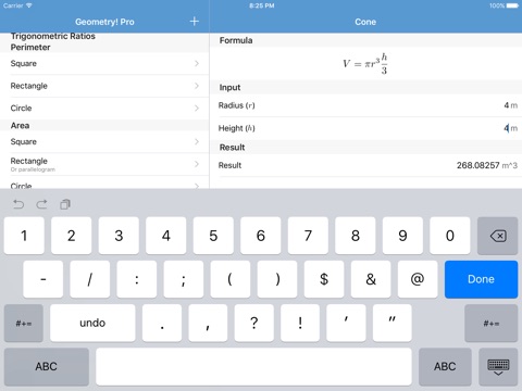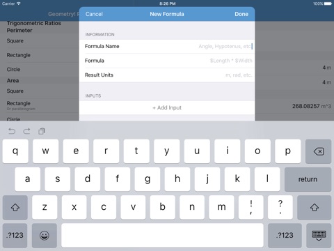 If you have a formula which is not included in Geometry! Pro, you can easily add it using the same formula adder found in Physics! Pro.