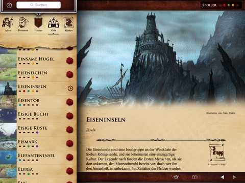 • Profile von mehr als 550 Orten mit Beschreibungen von Burgen, Städten, Regionen, geografischen Besonderheiten und vielem mehr.