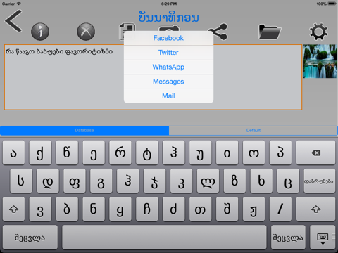 4. Share to all popular social networks like Facebook, WhatsApp, Twitter Or you can email or sms to anyone in Georgian.
