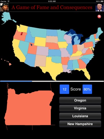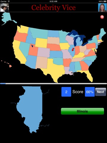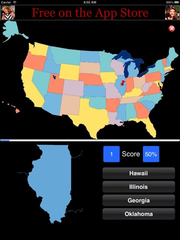 Identify the US States. GeoStates displays the outline of a state and marks its location on the map with a pin. You need to select the correct state name from a list of four.