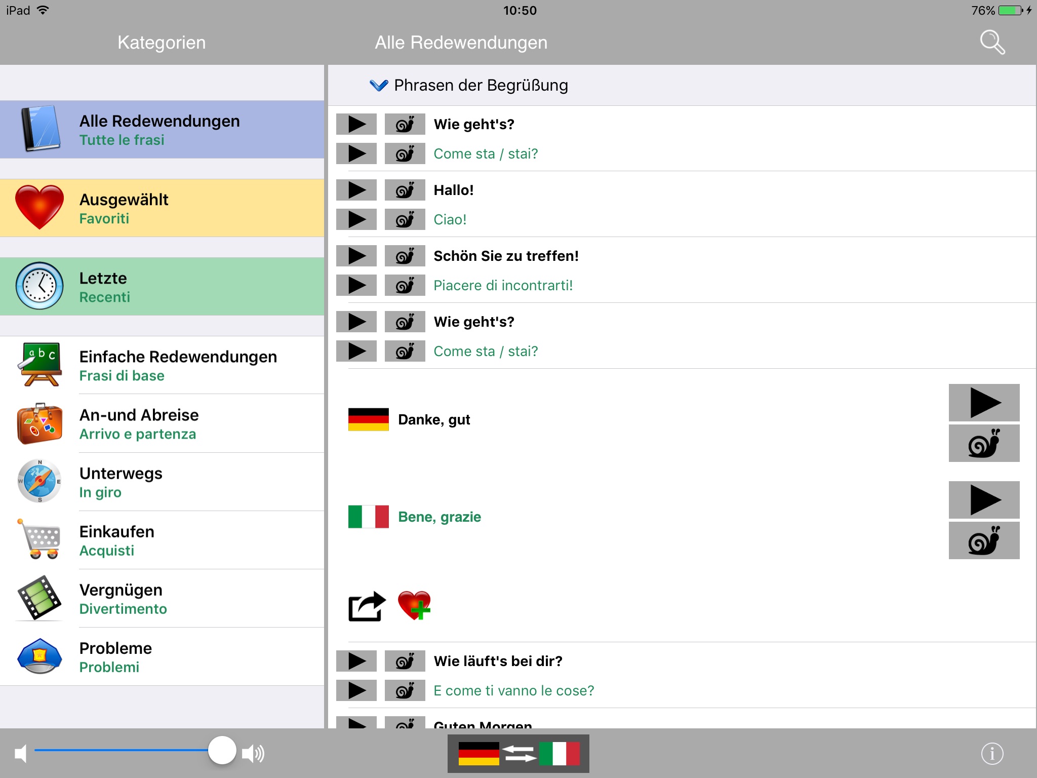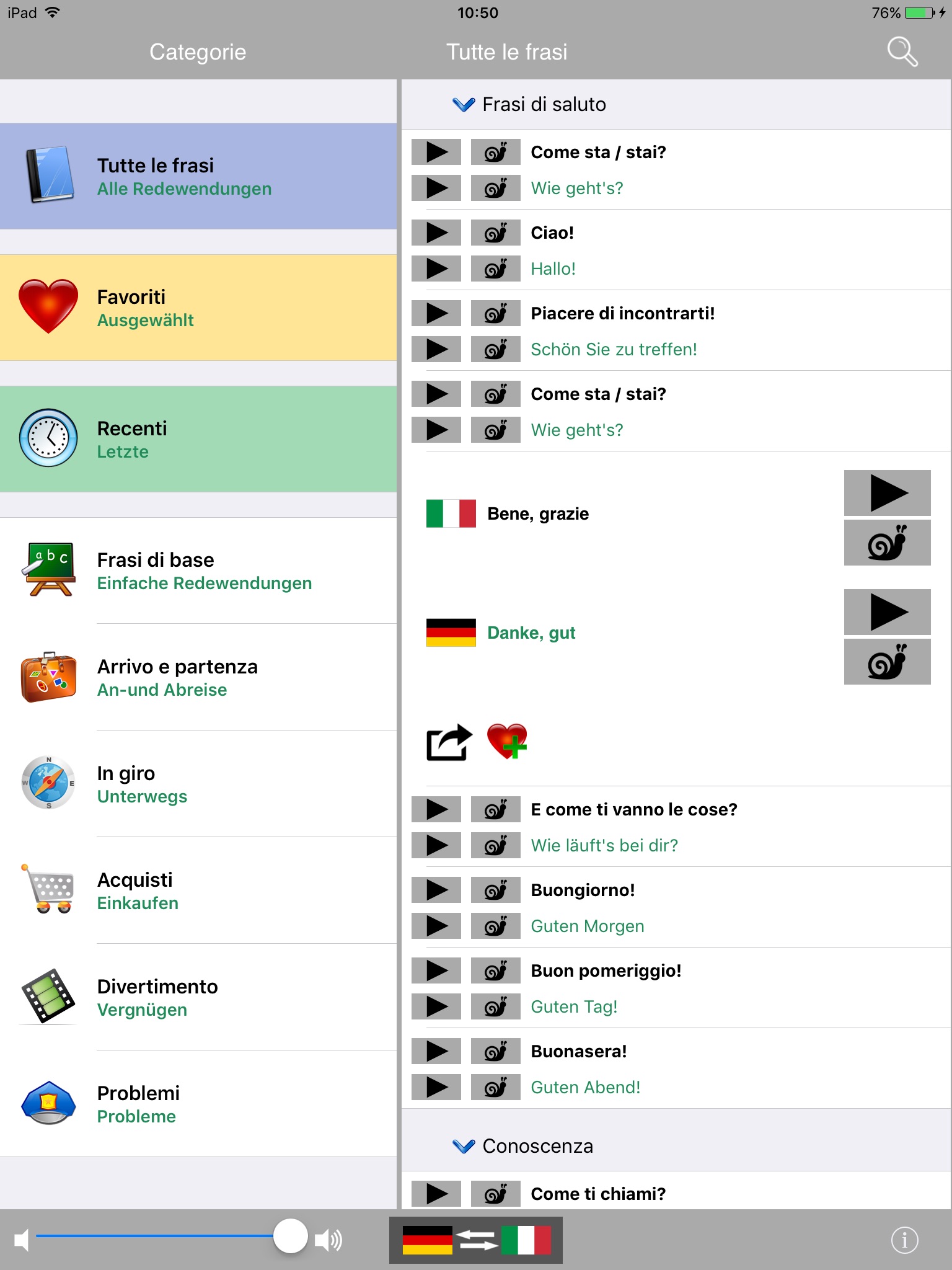 The German to Italian phrasebook and translator is also useful for language learning / improvement: you can save the phrases in a favorites section for easy access, and use them later to train yourself with the pronunciation.