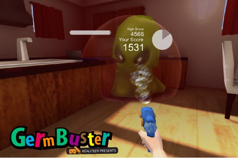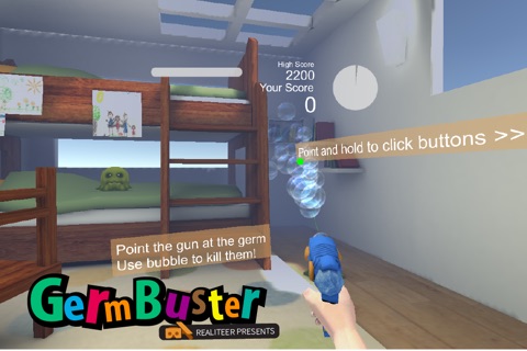 In GermBuster, "You" the player, are transported into an exciting new virtual world that you must clean-up by killing pesky germs. You are equipped with a state of the art virtual bubble gun and control the gun with you own hand!