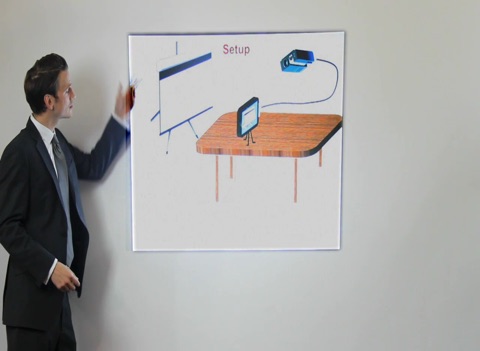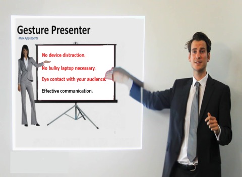 GesturePresenter enables you to present without the distractions from cables or hand-held gadgets. Maintain eye contact with your audience. Connect your iPhone/iPad to the meeting rooms projector. Gesture naturally to control the presentation without holding any device. Better than a remote clicker and cheaper and certainly cooler! You will need a low-cost stand.