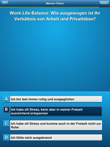 Ein Check-up zeigt ihm, wie gesund er lebt: ob er sich richtig ernährt, genug bewegt, zu sehr unter Stress steht, zuviel raucht oder trinkt. Mann bekommt Tipps und Ratschläge, erfährt, was gut oder schlecht ist, was er tun kann. Die Auswertung zeigt ihm, ob Mann im grünen oder roten Bereich ist.