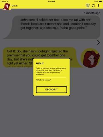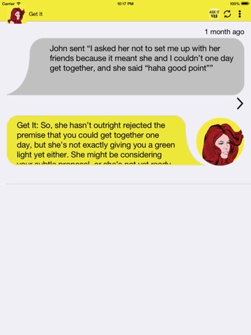 Get It is a mobile app that helps you decode your messages (text or verbal) from women. Follow the discussion here or download today