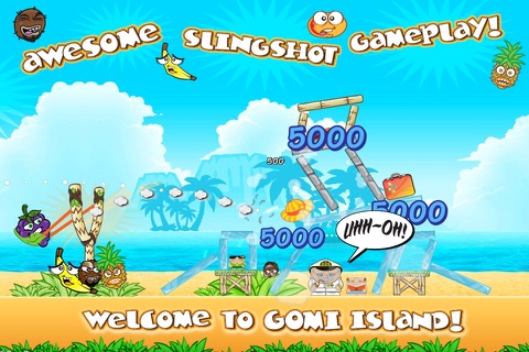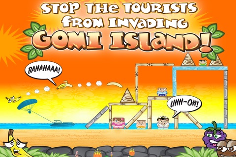 Tourists are invading GOMI island - use a slingshot to toss fruit at tourists & destroy their buildings, or create your own boards & share with friends.