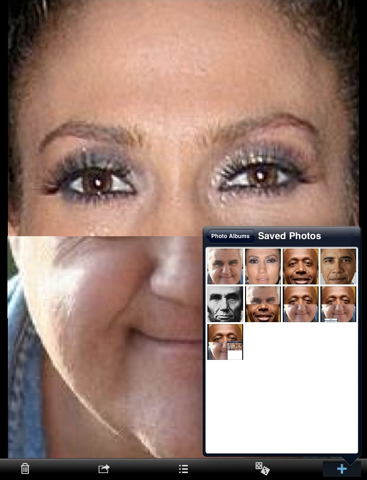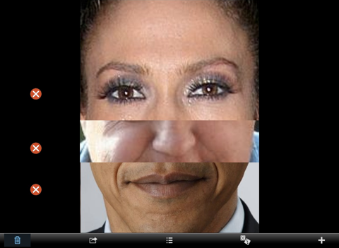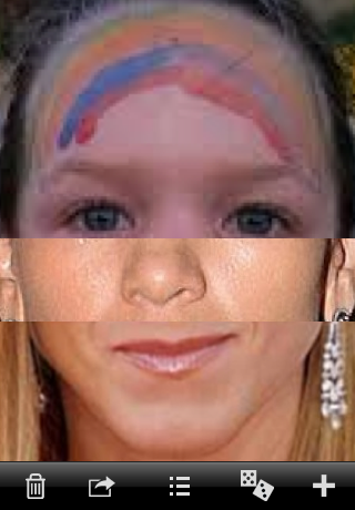 This is a FREE version of "Get Sliced". Try it here. You can mash up faces by scrolling in someones eyes, anothers nose, and yet another ones mouth from other faces! Its that simple. The photos provided are samples. Best enjoyment when you use your own photos.