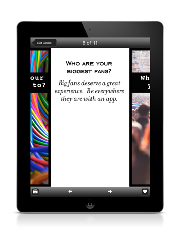 Quickly gain insight with showcase images and essence information displayed in a rotator gallery when device is landscape and as tiles when device is vertical. Tap a tile to flip it to the back to read more.