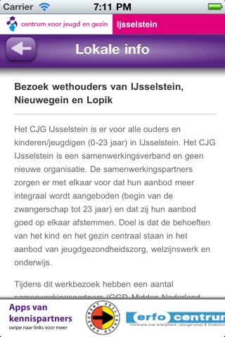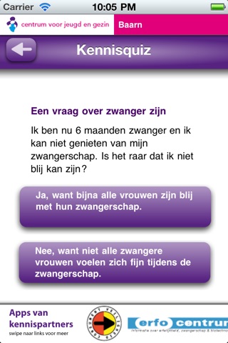 Ben je zwanger en wil je zo goed mogelijk voor jezelf en je kindje zorgen? Deze app bevat 100% betrouwbare informatie en praktische tips voor zwangere vrouwen (stellen). De app is gekoppeld met het Centrum voor Jeugd en Gezin (CJG) in jouw gemeente en bevat daarmee ook relevante lokale informatie waaronder lokaal nieuws, activiteiten en de contactgegevens van het CJG in jouw gemeente. Maandelijks zal met aansprekende videoproducties of podcasts verslag worden gedaan van ‘trending topics’ over gezond zwanger, gezond opgroeien en opvoeden. Op deze manier ben je altijd op de hoogte op basis van de best beschikbare, niet commerciële, informatie.