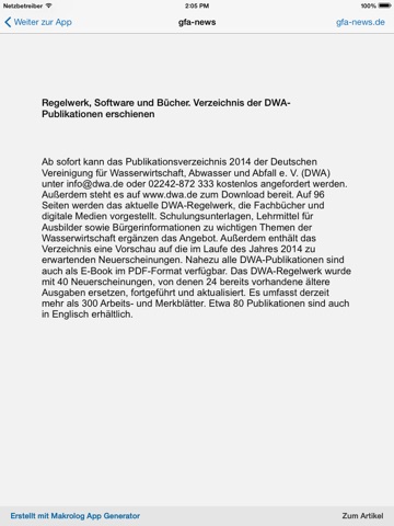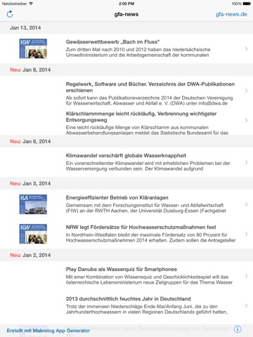 und neue Veröffentlichungen der DWA, zum Beispiel im Regelwerk, und Anzeigen von Unternehmen. Diese APP stellt die News im Bereich der Wasserwirtschaft übersichtlich dar und