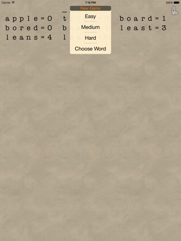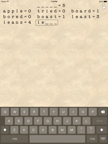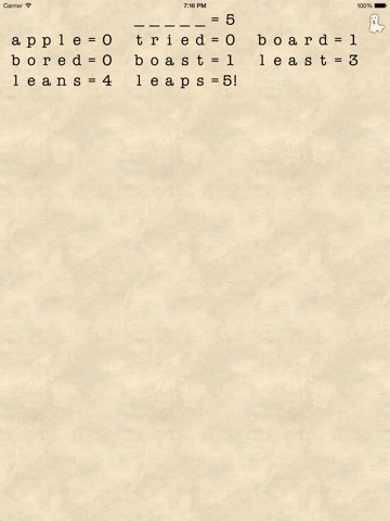 Ghost=5 is a guess-the-word game. A five-letter word is chosen and your goal is to figure out what the hidden "ghost" word is. You make a guess, and Ghost tells you how many letters match the "ghost" word. Let the game choose the word (easy, medium or hard), or select your own word for playing with friends.