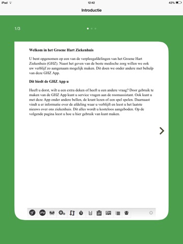 Deze applicatie is bedoeld voor patiënten die zijn opgenomen op een verpleegafdeling van het Groene Hart Ziekenhuis (GHZ). Als GHZ vinden we het belangrijk dat patiënten naast het krijgen van de beste medische zorg ook een comfortabel verblijf hebben in ons ziekenhuis. Om uw verblijf tijdens uw opname nog aangenamer te maken, heeft het GHZ een nieuwe service ontwikkeld: de GHZ App.