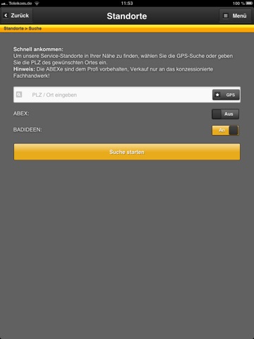 Den nächsten Standort per Postleitzahl oder GPS finden.