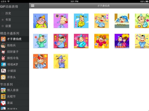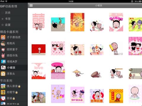 - 按照各种卡通主角、节日祝福、功能等来分类表情, 方便查找。