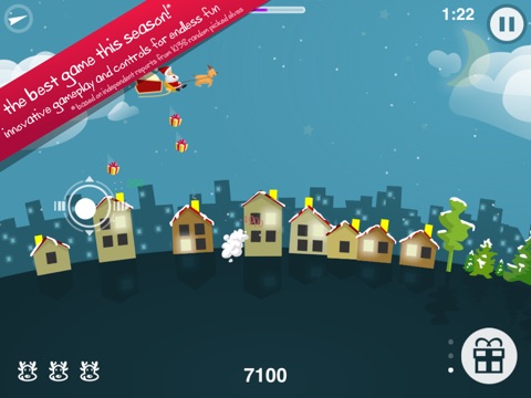* Dusk: Endless gameplay. Play as long as you want and deliver as many presents as you can. Watch out for obstacles, pay attention to the changing winds, and remember to avoid flying at high altitudes for too long. Santa will freeze!