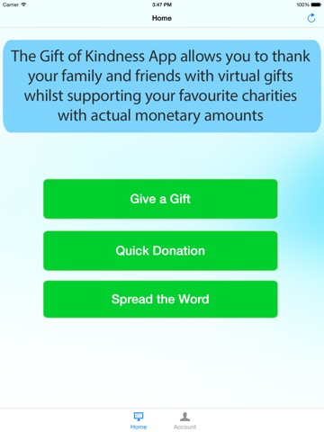 The App allows you to thank your family and friends with virtual gifts whilst making a meaningful monetary difference to the charity of your choice. The Gift of Kindness features include: