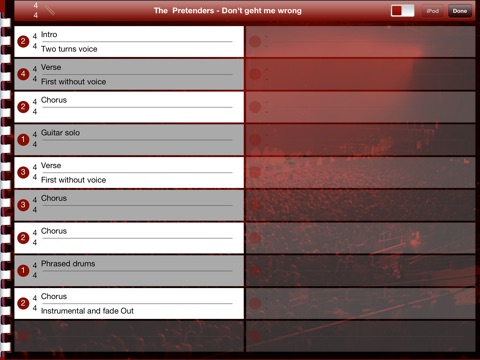 Write song sheets, lead sheets or chord sheets using text or chord annotations. Join them into songbooks and browse them while playing gigs or rehearsal. Know always what to play, how fast, in what beat, the chords the breaks and so on … . And if you need it on stage – find a torch light on board.
