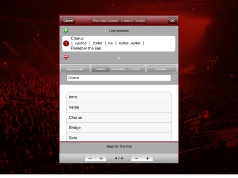 Write song sheets, lead sheets or chord sheets using text or chord annotations. Join them into songbooks and browse them while playing gigs or rehearsal. Know always what to play, how fast, in what beat, the chords the breaks and so on … . And if you need it on stage – find a torch light on board.