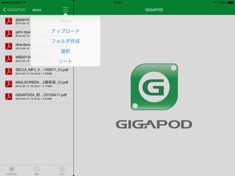 写真や動画のアップロード、リンク生成など、GIGAPODに保存したファイルをiPhone、iPadからアクセスする事ができます。 また、ファイルを他のアプリへ共有する事ができます。
