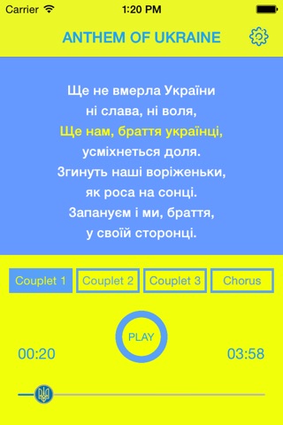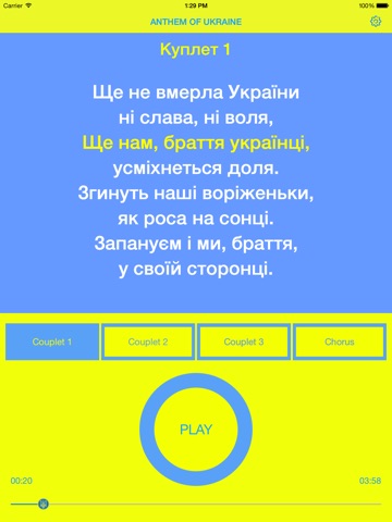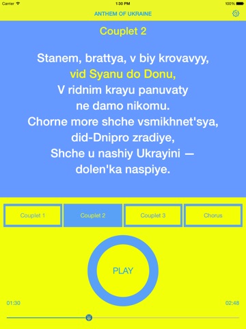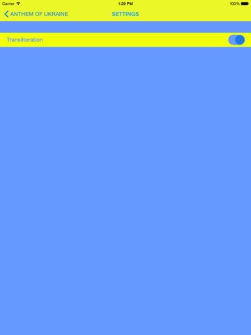 Додаток дозволяє прослуховувати гімн України та бачити виділеними слова, що зараз співаються. Є можливість ввімкнути транслітерований текст/