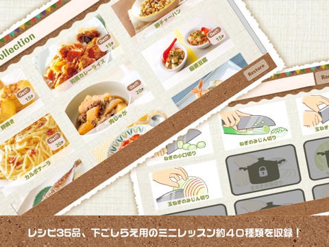 まったく料理をしたことがない方からちょっと自信がある方までカバーする、主婦の友社提供のレシピ35品(※随時追加配信予定)を収録。また、他社様のレシピや書籍で料理をする際に役立つ下ごしらえの仕方などを抜粋したミニレッスンを39種類収録(※随時追加配信予定)。ごちそう!ポイントを貯めて、ミニレッスンをコンプリートしよう!