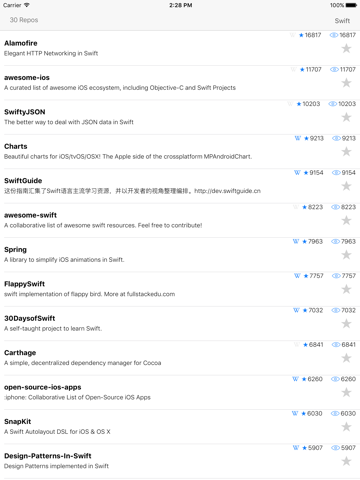 Watch the most common GITHUB projects . You can list them by language or all repos of all languages. And see their description right in the app. As the results are stored in a (REALM) database, you can even use the app when offline.