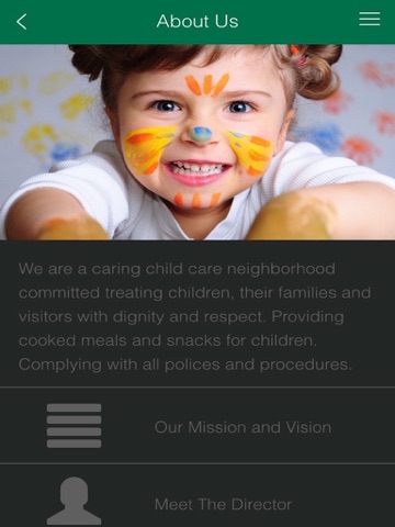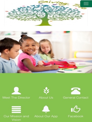 Giving Tree App to connect with parents. Offer daily information about child care. Features includes contact, mission, Facebook and push notifications.
