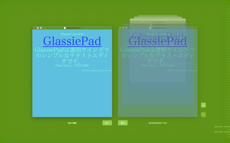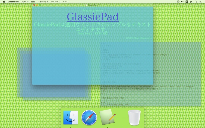 編集ウインドウが透明のテキストエディタです。標準テキスト(".txt",".html"等)やリッチテキスト(".rtf",".rtfd")ファイルを編集できます。
