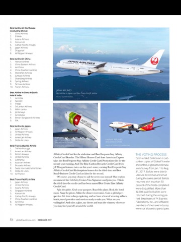 Global Traveler is a monthly magazine for the frequently traveling business and luxury elite. The editorial is focused on surveys and unbiased reviews of the worlds airlines, hotels and destinations. In addition, Global Traveler understands and highlights the epicurean aspects of travel, from the finest food wine in any city to the most luxurious golf courses and spas around the world. The magazine does not forget “need to know" information, including regular articles on travel health, technology and news. Global Travelers awards are respected worldwide and are looked upon as the absolute last word on the finest offerings in aviation and lodging.