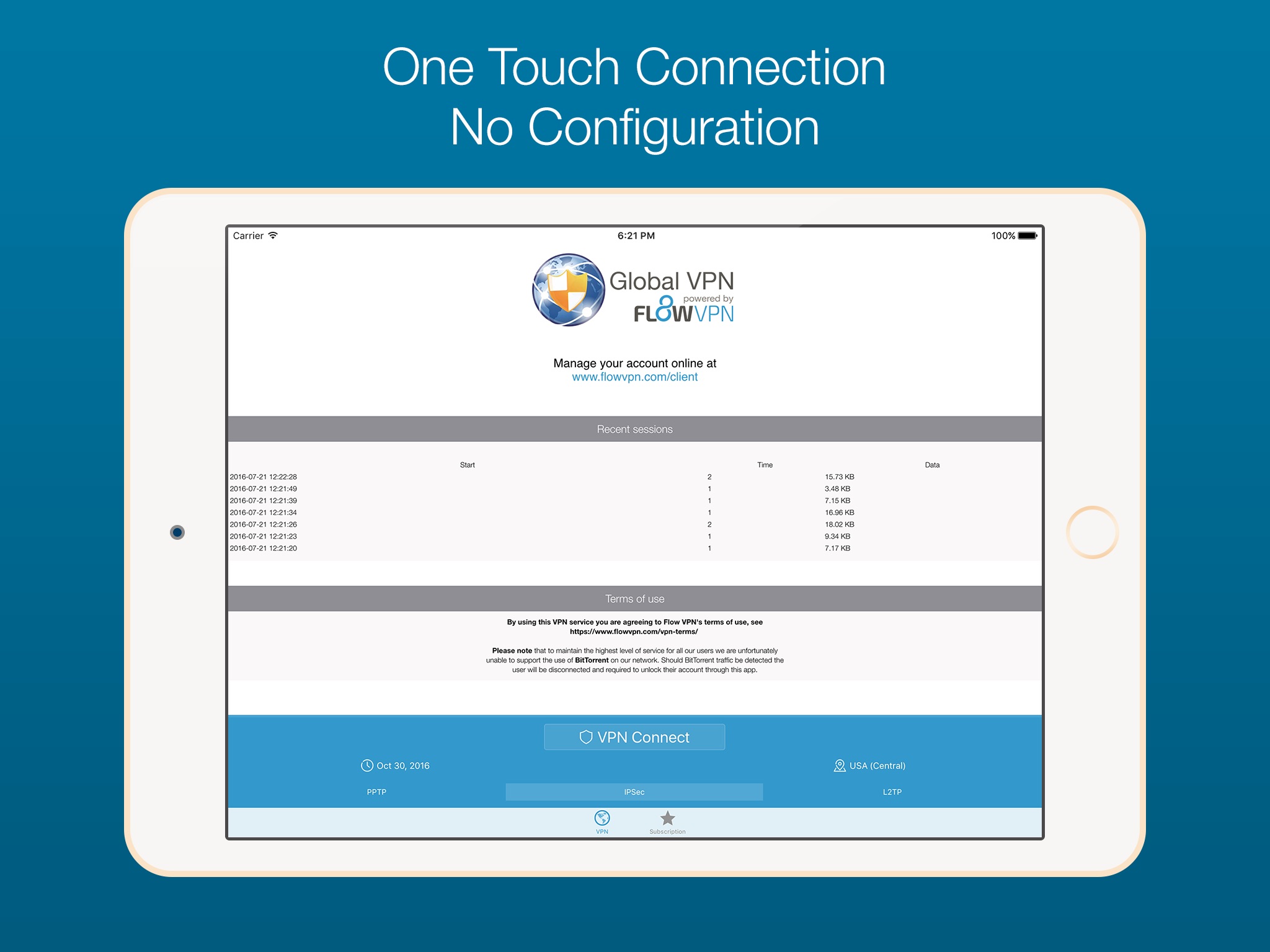 Access to the VPN service is subject to our terms and conditions, you will be asked to review and agree to these in the application. You can view them any time at https://www.flowvpn.com/vpn-terms/
