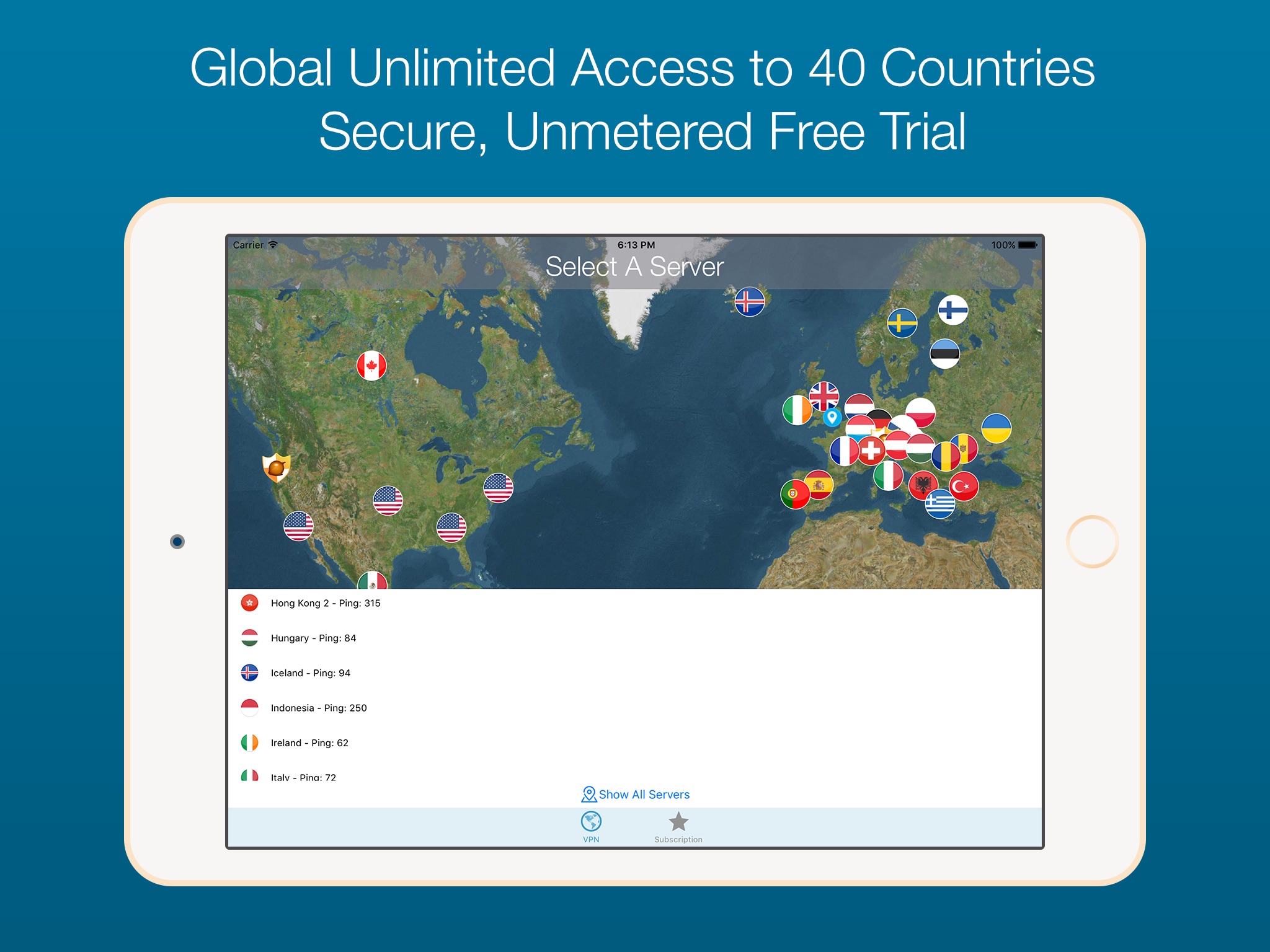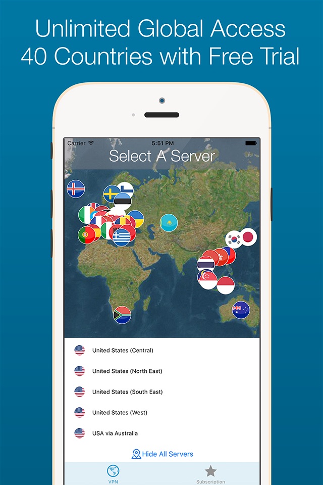 Global VPN secures and speeds up your Internet connection, transferring you around the globe. Simply select which country you want to surf the Internet from and Global VPN reroutes your traffic.