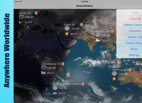 Well you need to touch the general area of where you want to see the weather, no way to search. Are the clouds depicted real or for show? There is no radar if thats your interest. If you dont mind guessing locations to get your weather youll probably like this.