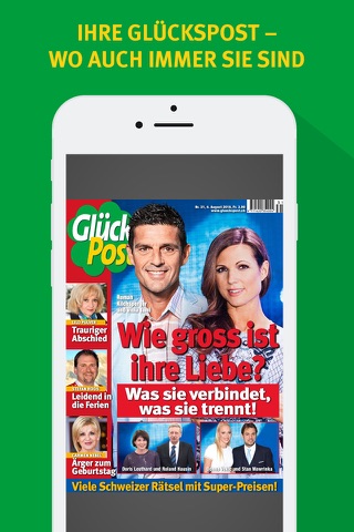 Die GlücksPost erzählt auf unterhaltsame Art und Weise die interessantesten Geschichten aus den Königshäusern, blickt hinter die Kulissen von Film- und TV-Studios, recherchiert schicksalshafte Storys im In- und Ausland und stellt Menschen vor, die im Rampenlicht stehen. Die GlücksPost gibt ausserdem konkrete Ratschläge – mit aktuellen Tipps für einen besseren Alltag.