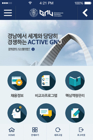 경상대학교 학생들의 경력을 관리하기 위한 시스템으로 꿈과 희망을 가진 창의적 개척자 육성을 목표로 입학부터 졸업 이후까지 적성탐색, 진로, 역량관리, 취업준비 등 개인의 가치를 키우는 모든 활동에 대한 정보와 서비스를 언제 어디서나 실시간 쌍방향으로 제공하는 서비스입니다.