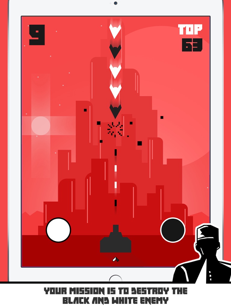 To destroy the black enemy, tap the black button. To destroy the white enemy, tap the white button.