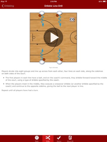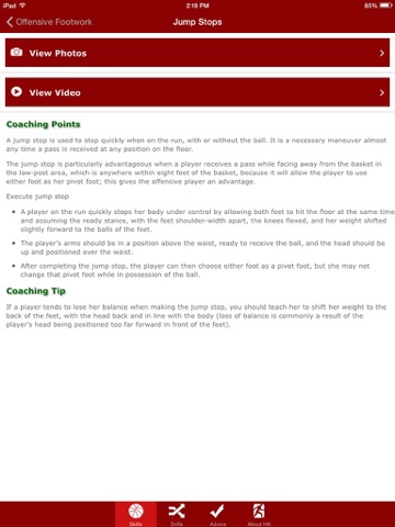 The Skills feature provides you with instant access to step-by-step instructions for executing a total of 27 offensive and defensive skills, including dribbling, passing, shooting, and defense. Video clips and photos demonstrate proper player positioning and skill execution.