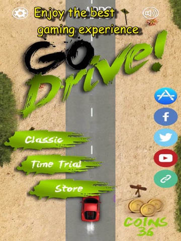 Go Drive is a really addicting and exciting racing game. You have to drive your car and arrive to the Finish line without running off the road. Always drive in the line!. You will find obstacles and prizes on the road, but also zombies at night. You can choose and buy the fastest race cars of the world, but also you have available battle tanks, the powerful bike "blue Twister" and even the Gooky’s spacecraft.